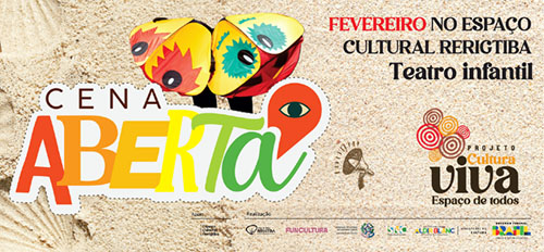 Cena aberta é uma programação mensal de apresentações de espetáculos do repertório do Grupo Rerigtiba realizada com recursos da PNAB, por meio do Funcultura-ES, Secretaria de Cultura do Estado do Espírito Santo, Governo do Estado do Espírito Santo – Ministério da Cultura – Governo Federal.