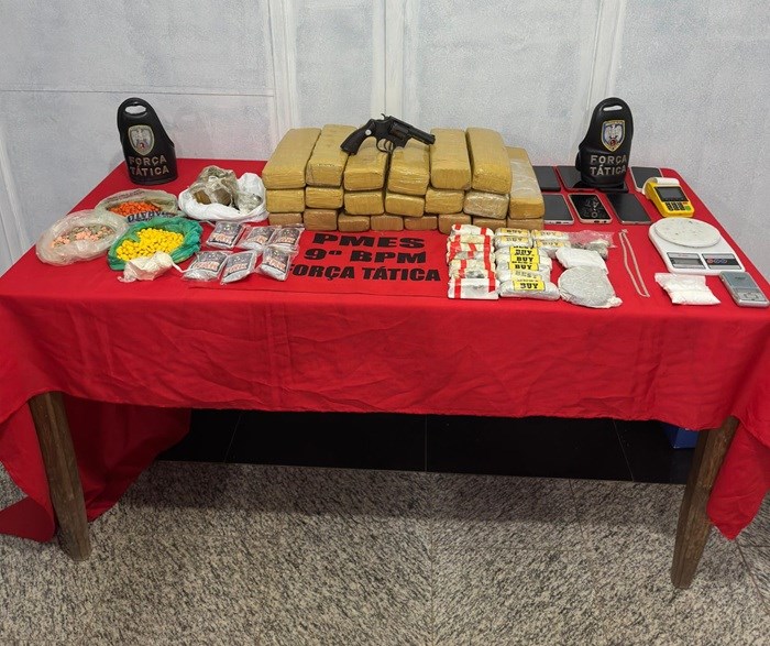 Militares da Força Tática do 9º Batalhão apreenderam, na quarta-feira (26), uma grande quantidade de drogas e uma arma de fogo durante operação realizada em Cachoeiro de Itapemirim, após receberem informações sobre atividades ilícitas no local.