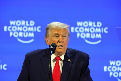 Mais cedo naquele dia, o presidente republicano dos EUA reconheceu o desconforto dos mercados financeiros com suas ameaças e descartou o uso da força em um discurso para a elite global na reunião anual do Fórum Econômico Mundial .
