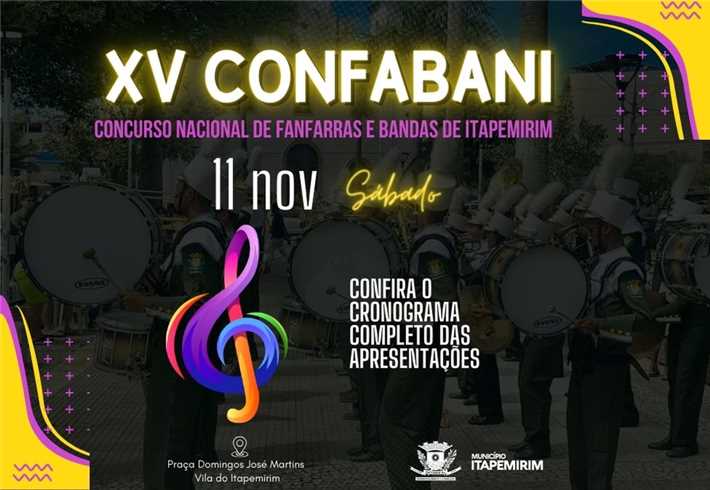Chegou o grande dia do retorno do Concurso Nacional de Fanfarras e Bandas de Itapemirim – CONFABANI, que acontece neste sábado, dia 11 de novembro, de 8 horas da manhã até às 20 horas, na praça da Vila.