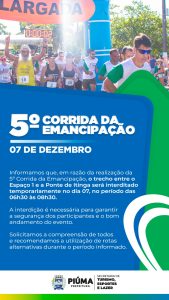 Em comemoração aos 61 anos de emancipação política, a Prefeitura de Piúma realiza a tradicional Corrida Rústica da Emancipação Política, que chega à sua 5ª edição em 2025. O evento esportivo, realizado pela Secretaria Municipal de Turismo, Esporte e Lazer, promete movimentar a cidade no domingo (7), reunindo corredores locais em uma manhã de celebração e saúde.