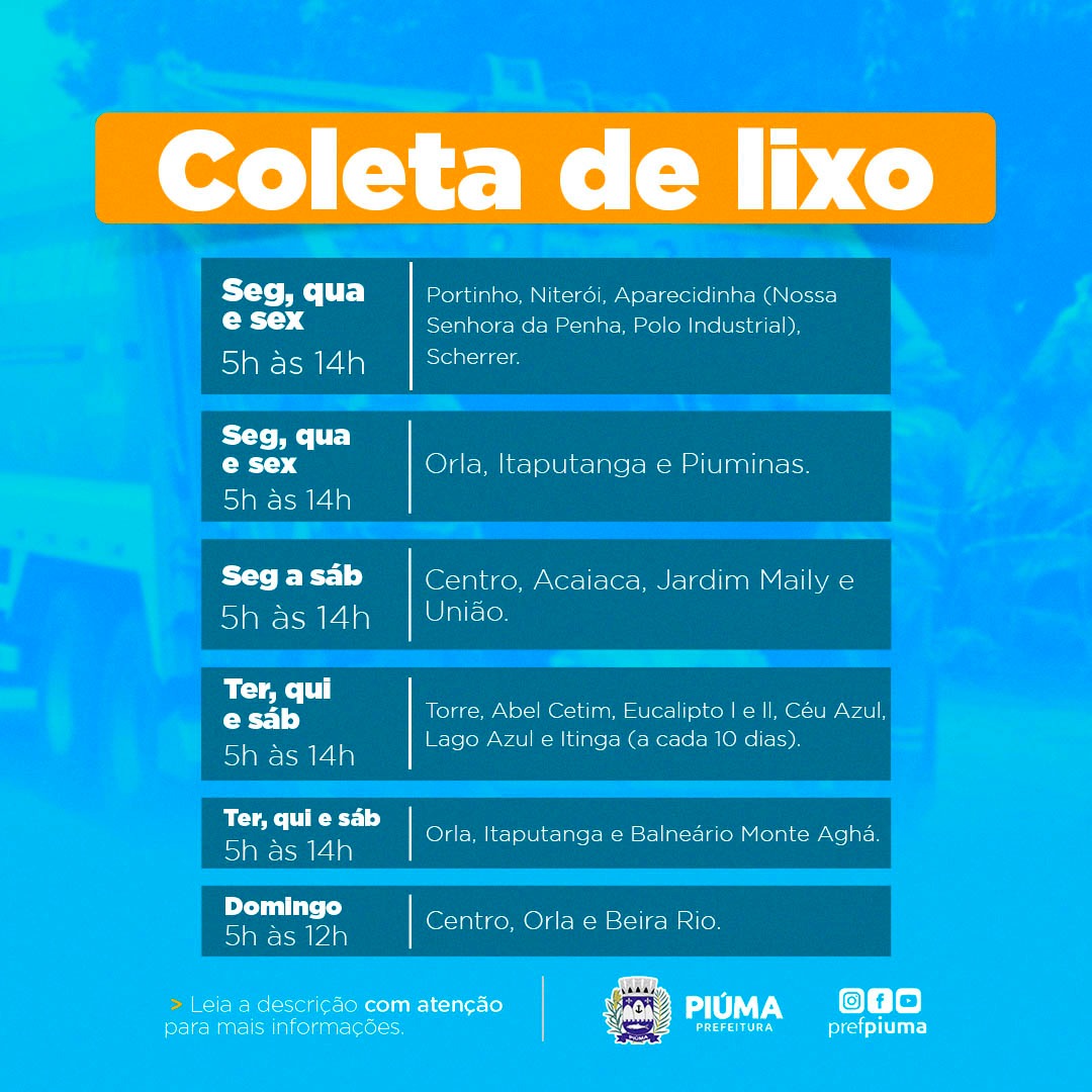 A Prefeitura Municipal de Piúma alerta para a mudança no cronograma da coleta de lixo no município, que se inicia na segunda-feira, 3 de abril.