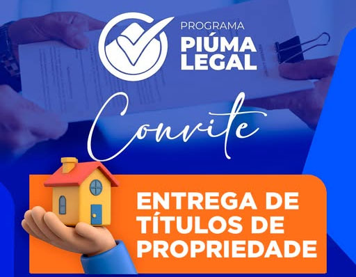 A Prefeitura de Piúma convida os moradores para a Entrega de Títulos de Propriedade, no bairro Lago Azul, na quinta-feira (18), às 19 horas. A Solenidade é uma importante ação do Programa Piúma Legal, que garante mais segurança jurídica e dignidade às famílias.